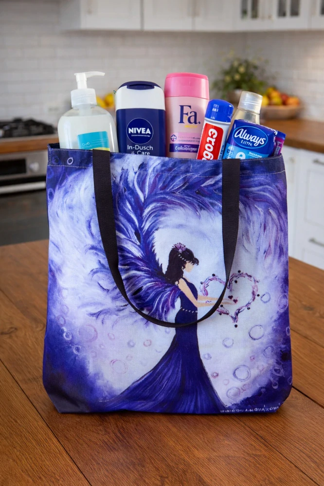 Andělská taška s energií levandulových květů, má rozměr 40x40cm, je skladná, praktická a elegantní. Pevný a skladný materiál vám zaručí že vše co do ní vložíte, dopravíte s grácií a elegancí přesně tam kam bude potřeba.