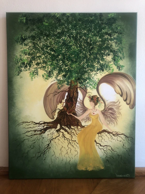 Obraz je olejomalba na plátně. Energie Andělky a strom života přináší ochranu, stabilitu, posílení a klid do rodiny a domova. Zakořeňuje rodinná pouta, vede k lásce, úctě, pokoře. Posiluje zázemí, stabilitu a přináší lásku.
