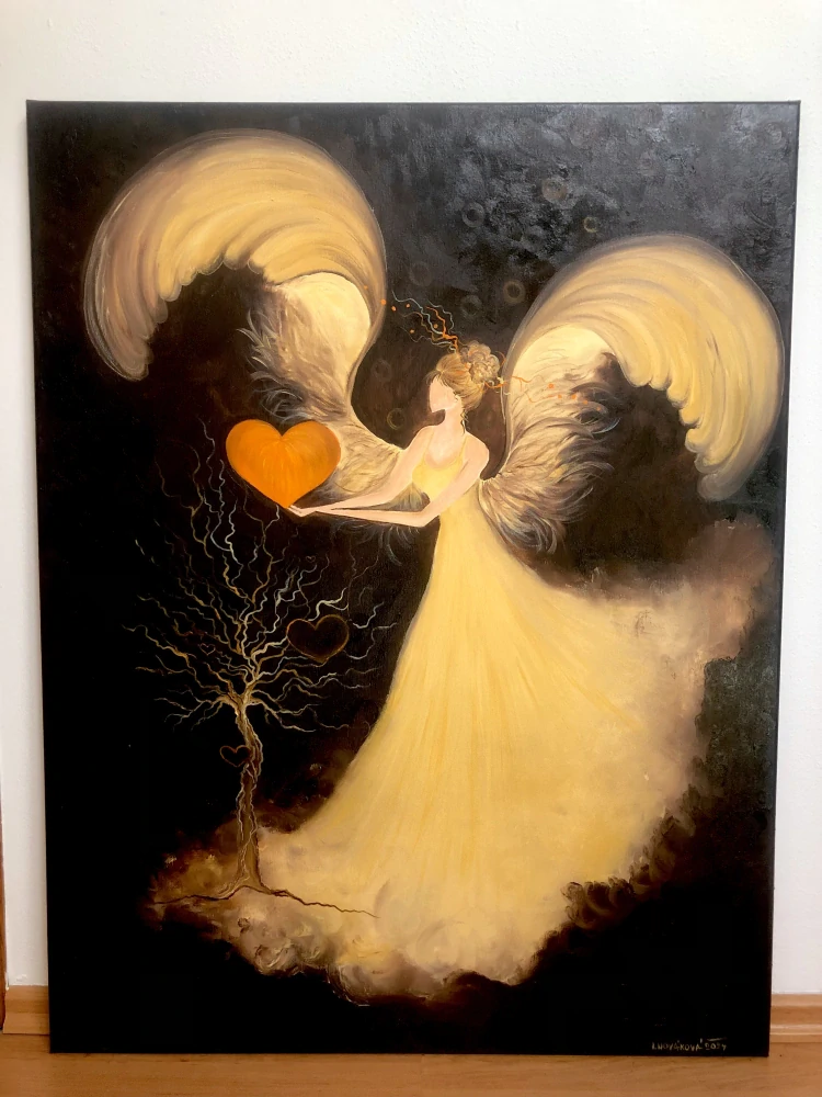 Obraz je olejomalba na plátně. Energie Andělky je posilující, upevňující a dodávající bezpečí. Andělka přináší stabilitu, ochranu na životních cestách, učí úctě a pokoře. Posiluje rodinná pouta a pomahá vytvářet zázemí a klid. Zahrnuje všechnen domov láskou a spokojeností.